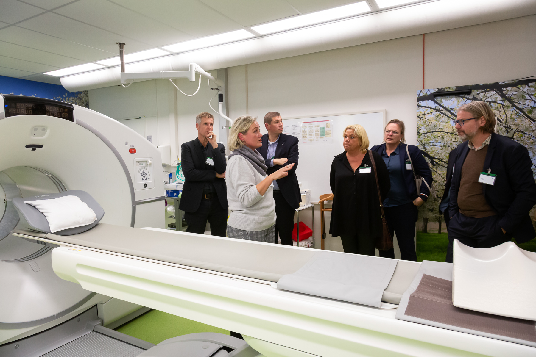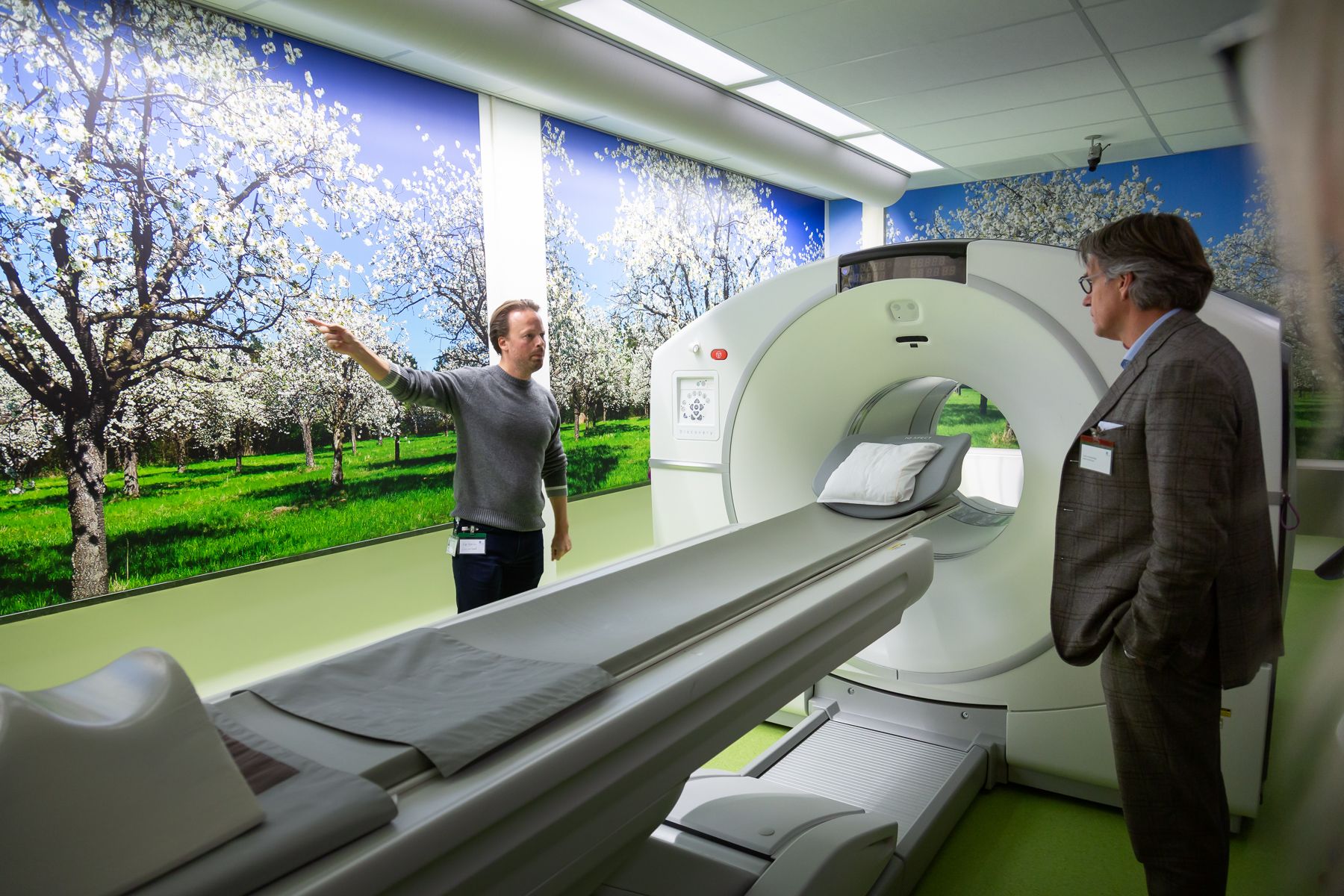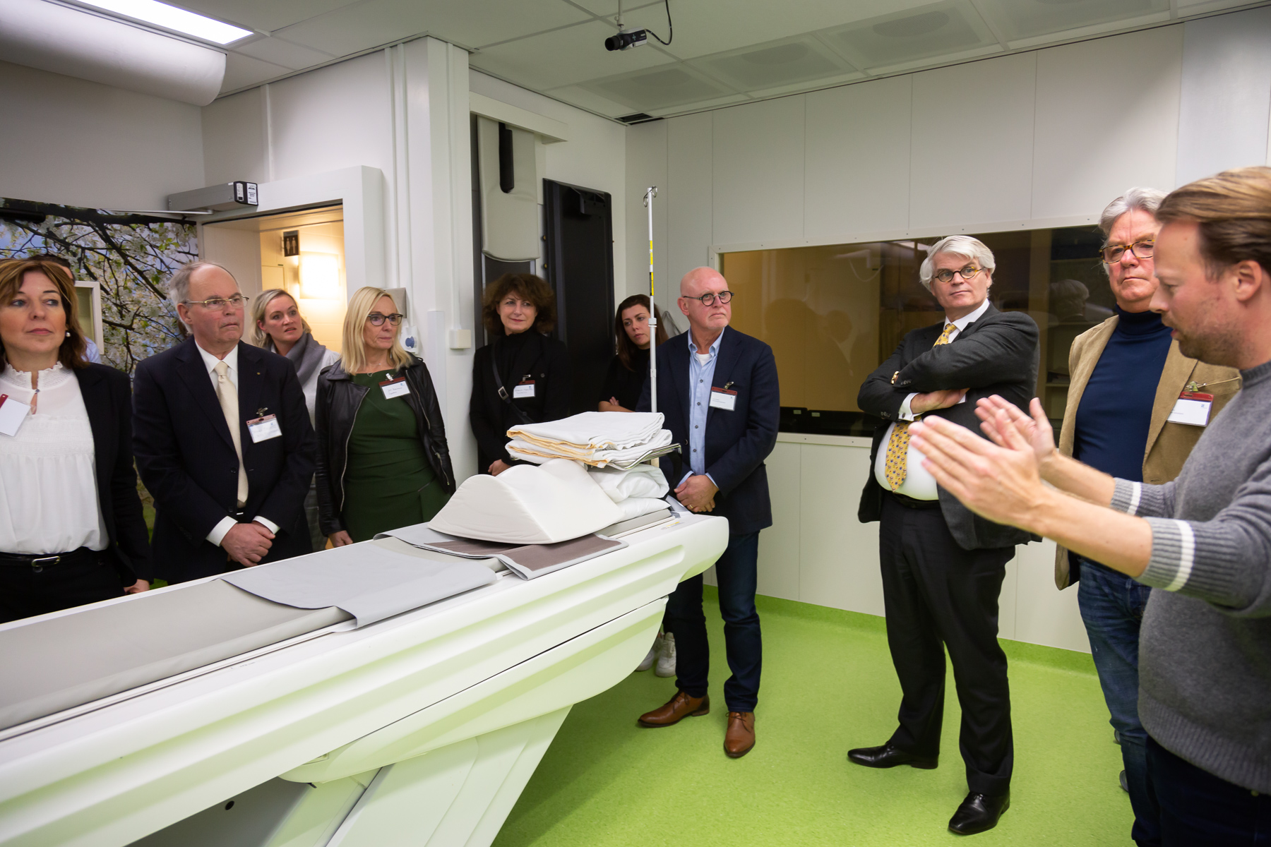 Hoe werkt een PET/CT-scan precies? Ook dat krijgen bezoekers van de Zuyderland Businessclub haarfijn uitgelegd op de afdeling Nucleaire geneeskunde. De patiënt krijgt via een prikje in de arm een kleine dosis radioactieve stof toegediend zoals glucose. Vervolgens maakt de PET/CT-scan foto’s, vaak om (uitzaaiingen van) kanker op te sporen of infecties. Dat werkt als volgt: kanker- en ontstekingscellen slurpen glucose. Door deze foto’s te beoordelen op een afwijkende glucose-consumptie worden de kankercellen en infecties opgespoord. Radioactieve stoffen worden ook gebruikt om aandoeningen te behandelen. Als voorbeeld behandelt de afdeling botuitzaaiingen bij patiënten met prostaatkanker.